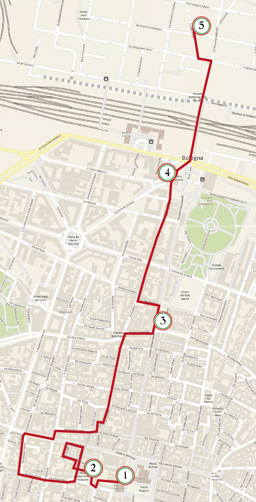 | 2 | ore 18.45 | Piazza Roosvelt | Si prosegue in via Rismondo, via Livraghi, Via IV Novembre, via Portanova, via Testoni, Galleria del Toro, via Ugo Bassi, via Nazario Sauro, via Monte Grappa, via Porta di Castello, via Galliera, via de' Falegnami |