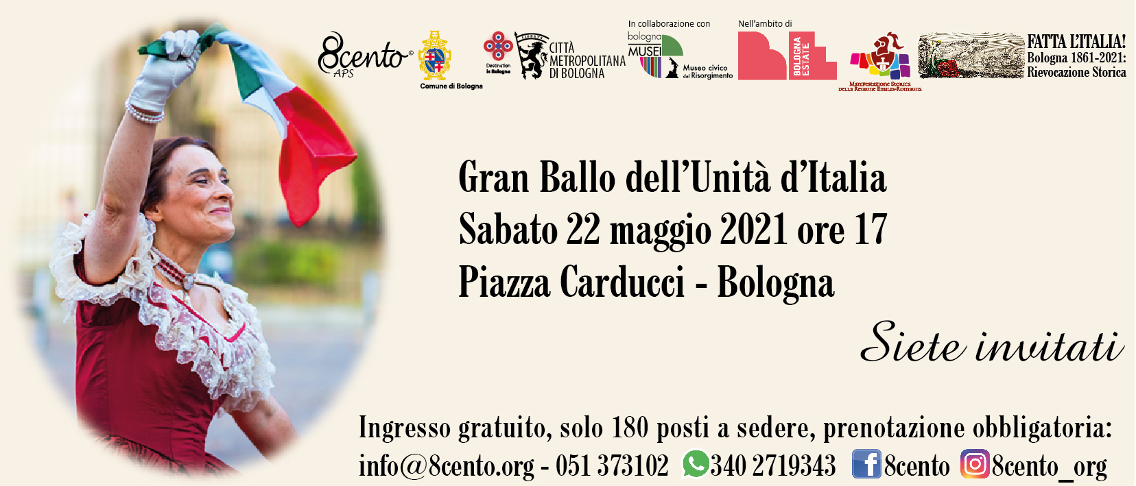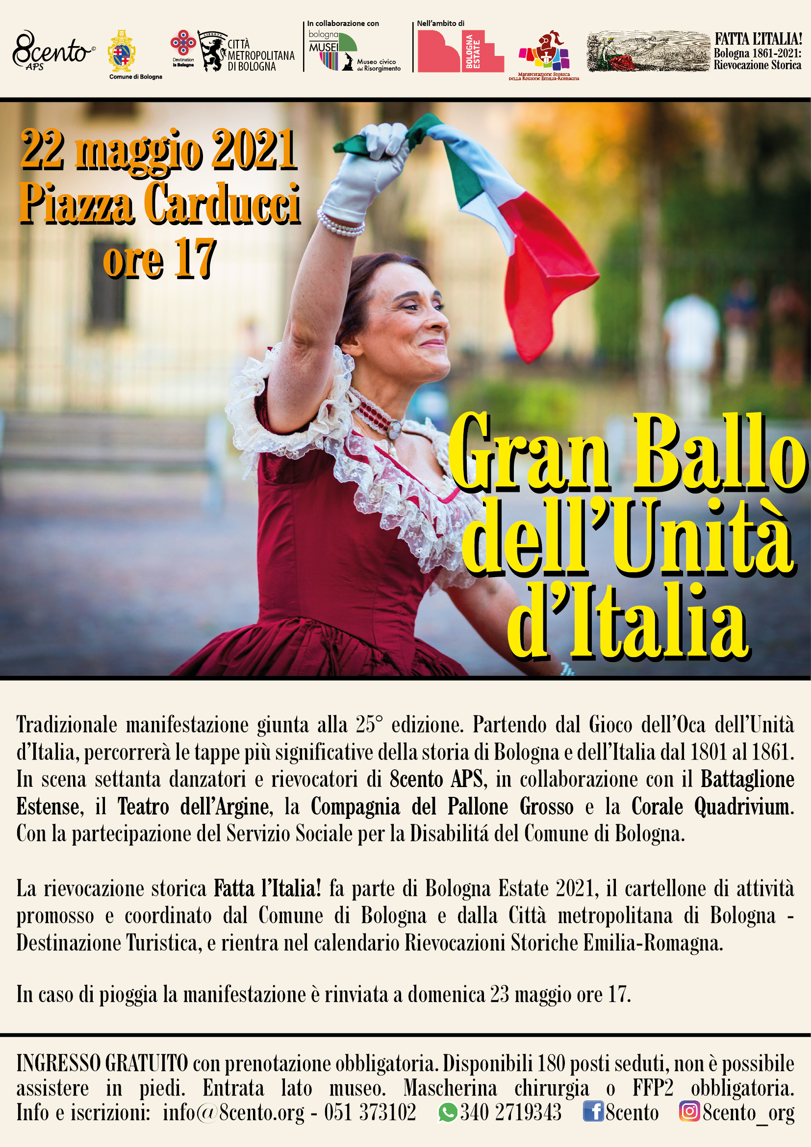 Tradizionale Gran Ballo dell'Unità d'Italia, giunto alla 25^ edizione. Partendo da Il Gioco dell’Oca dell’Unità d’Italia, concesso dal Museo civico del Risorgimento di Bologna, la manifestazione percorrerà le tappe più significative della storia di Bologna e dell’Italia dal 1801 al 1861. Il gioco dell'Oca dell'Unità d'Italia, qui rielaborato, venne ideato nel 1996 dalle insegnanti dell'Aula Didattica del Museo Maria Grazia Bonfiglioli e Maria Teresa Ganzerla; grafica di Claudio Pesci. Sessanta danzatori e rievocatori di 8cento APS, daranno vita al grande evento in Piazza, quest’anno in collaborazione con il Battaglione Estense, il Teatro dell'Argine di San Lazzaro di Savena, La Compagnia del Pallone Grosso di Monte San Savino e la Corale Quadrivium.